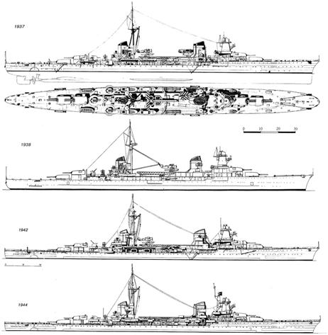8 pezzi da 152/53 mm. 6 pezzi da 100/47 mm 8 mitragliere da 37/54 mm. 8 mitragliere da 13,2 mm. 4 tubi lanciasiluri da 533 mm. 2 aeroplani